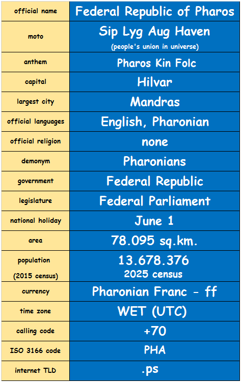 Pharos is an autonomous island-state in the North Atlantic Ocean. The Federal Republic was formed on June 1st 1975, when the people declared their full independence from Great Britain.
